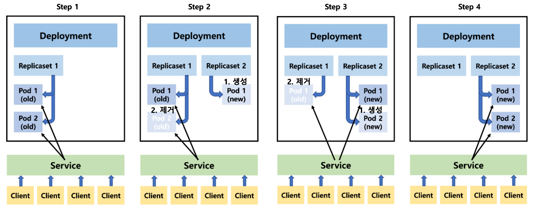 Fig 2.는 파드를 old 버전에서 new 버전으로 바꾸는 예제이다. 각 버전은 레플리카셋에 의해 2개씩 생성된다. 롤아웃 시 디플로이먼트는 new 버전의 파드를 템플릿으로 하는 레플리카셋을 생성한다. 그리고 해당 레플리카셋은 new 버전 파드를 생성한다. (step 2) new 버전 파드 하나의 생성이 완료되면, old 버전 파드 하나를 제거한다. (step 3) 한 번 더 new 버전 파드를 생성하고, 생성이 완료되면 old 버전 파드 나머지를 제거한다. (step4) 최종적으로 new 버전 파드 2개가 생성된다. 전 과정에서 파드 2개가 계속 실행되고 있기에, 사용자(client)는 계속해서 서비스를 통해 파드 서비스를 이용할 수 있다.