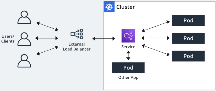 외부로 부터 접근이 가능하게 서비스를 설정할 수 있다. 밑에서 정리하겠지만 서비스는 노드의 IP를 빌리거나(NodePort 타입 서비스) 외부 Load Balancer(LoadBalancer 타입 서비스)를 이용해 외부 네트워크에 공개된다. 이를 통해 드디어 외부 사용자가 애플리케이션에 접근할 수 있다. 반대로 파드가 클러스터 외부 애플리케이션에 접근할 때에도 서비스가 사용될 수도 있다. (이 경우에는 서비스를 꼭 사용하지 않아도 된다.)