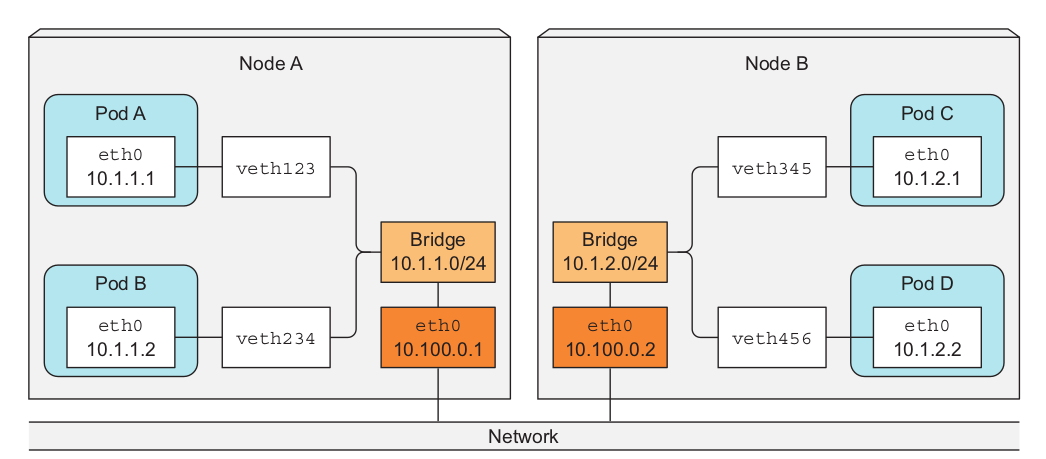 Fig 1.과 같이 모든 파드는 쿠버네티스 클러스터 안에서 가상 IP 하나를 부여받는다. 이 가상 IP는 쿠버네티스 클러스터 안에서 유일하며, 쿠버네티스 클러스터 내에서만 유효하다. 이 가상 IP를 통해 같은 쿠버네티스 클러스터 내의 파드들끼리는 통신이 가능하다. 예를 들면 Fig 1.에서 Pod A가 Pod C와 통신하기 위해서 10.1.2.1로 패킷을 보내는 것이 가능하다.