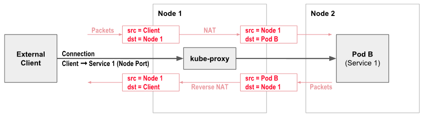 위에서 설명한 내용을 Fig 4.를 통해 좀 더 구체적으로 정리해보자. ClusterIP는 클러스터 내에서만 유효한 가상 IP이기에 ClusterIP 유형 서비스는 파드간 통신을 위해 대부분 사용된다. Fig 4.에서 Pod A는 Service 1의 ClusterIP를 통해 접근하고자 한다. Pod A의 네트워크 트래픽은 Node 1에서 나가지 전 kube-proxy(iptables)의 Destination NAT(DNAT, 목적지 주소가 바뀌는 것)에 의해 목적지 주소가 서비스의 ClusterIP에서 Pod B의 ClusterIP로 바뀐다. Pod B이 보낸 응답 트래픽 또한 kube-proxy에 의해 소스(src)가 Pod B -> Service의 ClusterIP로 변경되어 Pod A로 전달된다. 이러한 과정을 통해 Pod A는 정상 통신되었다고 판단한다.