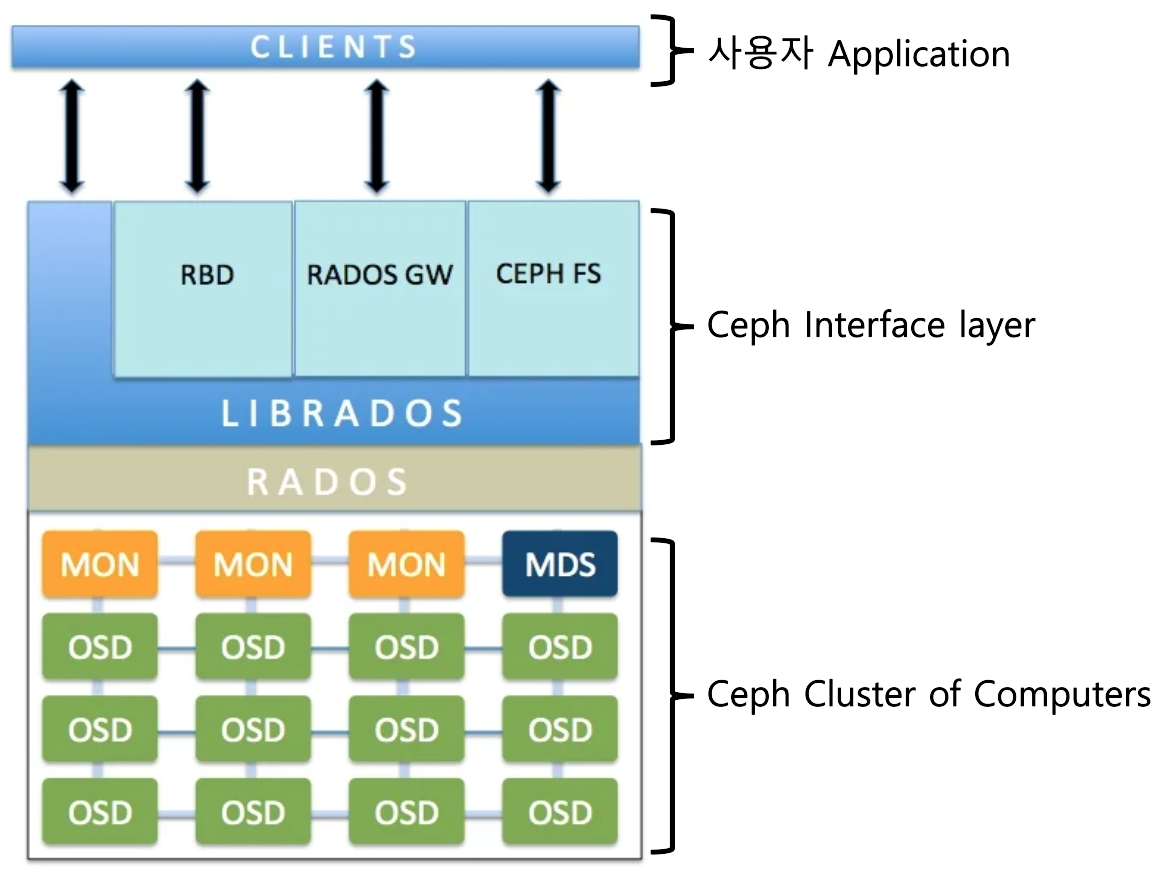 사용자 application(Ceph-client 혹은 직접 만든 애플리케이션)은 Ceph의 interface를 이용하여 Ceph에 데이터를 쓰거나 읽는 프로그램이다. 특히 후술하겠지만 Ceph는 다양한 interface를 제공하기에 Ceph를 사용하는 application은 다양한 방식으로 Ceph를 이용할 수 있다.