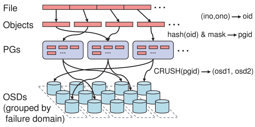 일단 Object ID에 따라 object들을 PG로 분류한다. 그리고 PG마다 어떤 OSD에 저장될 지 정보를 관리한다. 이러면 object 하나하나에 대해서 OSD 정보를 관리할 필요없이, PG 마다만 어떤 OSD들에 저장될 지 정보를 관리해도 된다. 특히 object ID로부터 PG를 구하는 식도 hash 함수를 통해 간단히 구현된다.