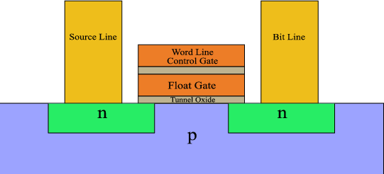 플로팅 게이트는 위아래로 부도체인 산화막으로 감싸져 있다. 따라서 전자가 플로팅 게이트 안으로 혹은 밖으로 이동하지 못한다. 다만 Control gate에 강한 양전압을 걸어주면 실리콘 기판(p 영역) 속 전자가 터널링 효과에 의해 플로팅 게이트로 이동한다. 한번 플로팅 게이트에 갇힌 전자는 다시 외부에서 강한 전압으로 힘을 주지 않는다면 영구적으로 플로팅 게이트에 저장된다. 실리콘 기판에 강한 양전압을 걸어주면 플로팅 게이트에 갇힌 전자는 빠져나와 실리콘 기판으로 이동한다.