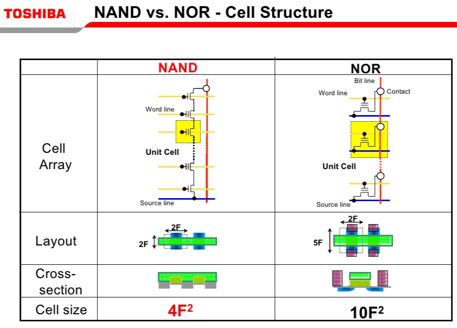 NAND의 경우 cell들이 직렬로 연결되어 있다. 만약 Cell 하나를 읽고 싶다고 하자. 그러면 일단 직렬로 연결된 나머지 모든 Cell들을 ON 시켜야(=나머지 모든 Word line들에 강한 전압을 줘야) 해당 Cell의 내용을 읽을 수 있다. 따라서 Cell 하나를 읽고 쓰는데 시간이 오래 걸린다. 그에 비해 NOR의 경우 cell들이 병렬로 연결되어 있다. 따라서 해당 Cell만 조종하면(해당 Cell의 Word line에만 전압을 걸어주면) 그 Cell을 읽고 쓸 수 있다. 따라서 읽고 쓰는 시간이 빠르다.