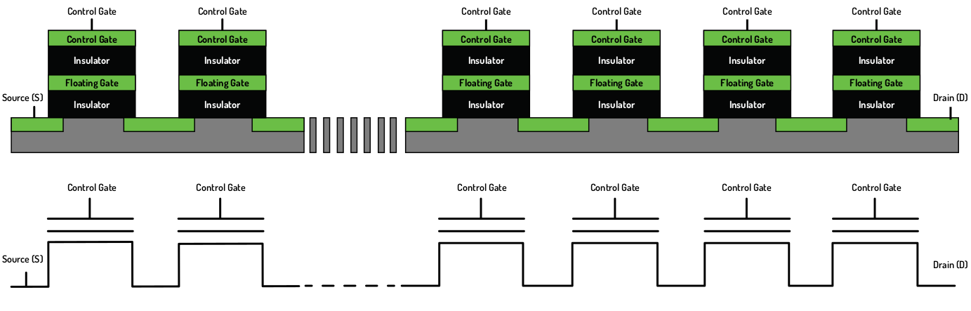 읽기를 예를 들면, 첫번째 Word line에만 다른 신호를 주면 첫번째 Page에 위치한 모든 Cell의 데이터를 한번에 읽을 수 있다. 구체적인 방식은 다음과 같다. 만약 7번째 Page를 읽고 싶다면, 7번째 Word line에는 약한 전압을 인가하고, 나머지 Word line에는 강한 전압을 인가한다. 나머지 Word line에 강한 전압을 인가하므로서, 나머지 Page들은 항상 switch on된다. 이제 7번째 Page에 집중하면, 만약 7번째 Page의 cell들중 Floating gate에 전자가 차 있지 않으면 약한 전압에 의해서도 switch on될 것이고, 차 있다면 switch off될 것이다. 이를 통해 해당 Page의 cell들의 Floating gate에 전압이 있는 지 아닌지를 알 수 있다[4].