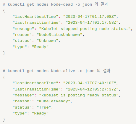 - Node 오브젝트의 status 필드를 Ready에서 NotReady(or Unknown)으로 업데이트