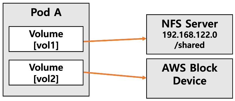 위 yaml 코드를 보면 Pod-spec-volumes 밑에 [nfs-pvc]라는 볼륨이 정의된 것을 확인할 수 있다. 이처럼 볼륨은 파드에 종속적이다. 그렇기에 해당 파드가 종료되면 그 밑에 정의된 볼륨들 또한 모두 제거된다. 다만 주의할 점은 볼륨 = 스토리지(데이터 저장소)를 의미하는 것이 아니고 스토리지를 가리키는 인터페이스 역할이기에, 볼륨이 제거된다고 해도 꼭 데이터가 제거된다는 것은 아니다. (Fig 1.과 참고. Pod A가 삭제되면 vol1, vol2는 삭제되지만, NFS Server, AWS Block 등 외부 스토리지는 삭제되지 않는다. 자세한 설명은 밑에서 계속)