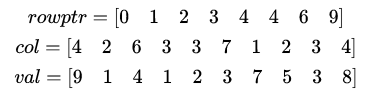 row array를 없앤 대신 rowptr array를 사용한다. rowptr[i]=j는 col array의 j번째 인덱스부터 i번째 row와 매칭이 된다는 것을 나타낸다. 예를 들어 위 그림에서 rowptr[6] = 6, rowptr[7] = 9인데, 이는 col[6], col[7], col[8]의 row는 6이고, col[9]의 row는 7이라는 것이다. 따라서 다음과 같음을 알 수 있다.