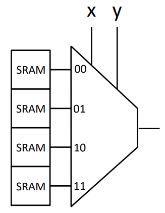 n-LUT는 n개의 input이 주어지는 임의의 논리회로를 구현할 수 있다. 2^n개의 configuration bits(SRAM)과 2개의 input, 그리고 input에 따라 configuration bits를 선택하는 multiplexer로 구성된다. 어떤 논리회로든 n개의 input에 대한 진리표를 만들어 단순하게 표현할 수 있는데, 이와 같은 개념으로 진리표 자체를 SRAM에 저장하고 input에 따라 그 값을 출력하는 원리이다. 다음은 2-LUT로 다양한 논리회로를 만든 예시이다.