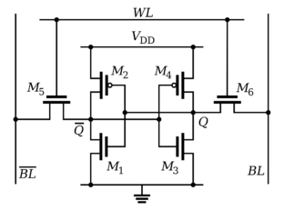 SRAM은 위 그림과 같이 6개의 transistor로 구성된다. DRAM처럼 capacitor에 전하를 저장하는 것이 아닌, latching 회로 (flip-flop)을 사용하여 데이터를 저장한다. Bit 정보는 M1, M2, M3, M4 transistor가 포함된 회로에 저장(정확히는 Q와 ~Q 위치의 전압)되며, M5, M6 transistor는 cell 접근을 위한 switch 역할을 한다.