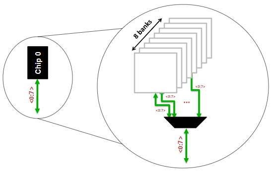 Chip은 여러 개의 bank들로 구성된다. Chip은 8bit width data bus를 가지고 있으며 각각의 bank는 mux를 통해 chip의 data bus를 공유한다.