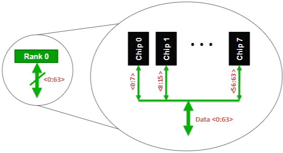 DIMM은 여러 개의 칩으로 구성된다. 주로 DIMM의 앞, 뒤에 칩이 붙으며, 1행 2열 혹은 2행 8열, N행 8*M열로 구성된다(ECC 메모리의 경우 9*M열). 1행의 8개 칩씩 하나의 rank를 구성한다. Fig 5.의 bus 구성을 보면 DIMM은 64bit data bus를 가지는데, 이 bus를 모든 rank가 공유한다. Rank를 구성하는 각각의 칩은 8 bit width bus를 독립적으로 차지한다. 따라서 한 rank 내 각각의 칩들은 병렬로 데이터 전송이 가능하다. (아직 추측인데, double precision floating point 64bit 저장 시 8bit씩 각 chip에 나눠서 저장되는 게 아닐까 싶다. 찾아봐야 겠다.)