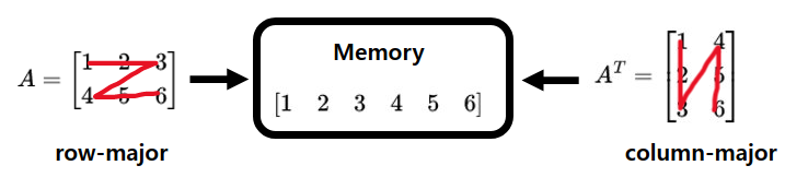 따라서 Eq 2.와 같이 C transpose는 B transpose와 A transpose를 곱하면 구할 수 있고, column-major에서 C transpose를 구한다는 것은 row-major에서 C를 구하는 것과 동일하기에 우리가 원하는 row-major C를 얻을 수 있다. Column-major에서의 B transpose와 A transpose는 모두 row-major에서의 B와 A와 완전히 일치하게 메모리에 저장되기에 단순히 B*A만 해도 C를 구할 수 있다.