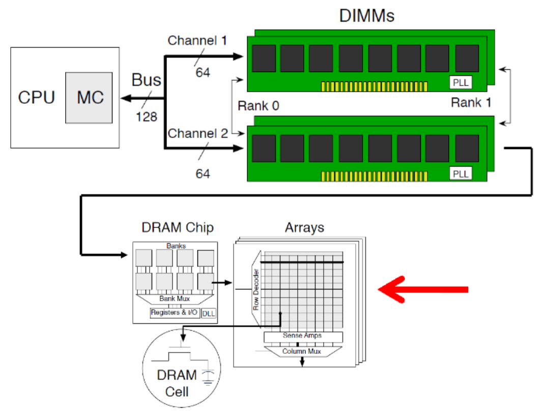 Fig 1.은 DRAM memory system을 요약한 것이다. 그림에서 보듯 DRAM system은 Channel-DIMM-Rank-Chip-Bank-Array의 순서로 hierarchically 구성된다. 이렇게 복잡한 계층 구조를 가지고 설계된 이유는 memory wall (CPU와 메인 메모리 간의 데이터 전송 병목에 의한 성능 향상 한계)를 극복하기 위해, DRAM 속 데이터를 병렬로 접근할 수 있도록 하기 위해서 이다. 오늘은 이러한 계층 구조 및 데이터 접근 병렬성에 대하여 [2] 자료를 참고하여 분석해본다.