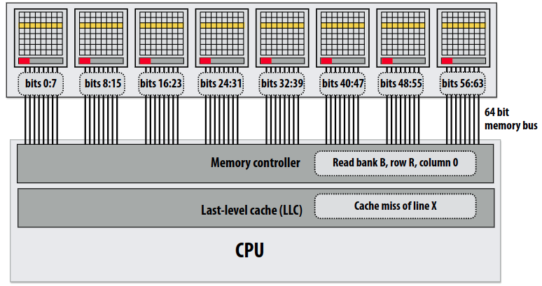 파랑 byte을 읽기 위해서는 해당 PRE하고 해당 row를 row buffer로 읽어온다(RAS). 이후 파랑 byte만 읽어서 전송(CAS)한다. 주황의 경우 이미 해당 row가 row buffer에 있기에 CAS만 실행한다. 초록과 보라는 각기 다른 row에 있기에 파랑과 같이 PRE-RAS-CAS를 실행한다. 이 예제에서 보면 알듯, 한 row에 있는 데이터를 연속해서 접근할 경우, PRE와 RAS가 생략되어 빠르게 데이터 전송이 가능하다. 따라서 만약 여러 byte를 전송해야 할 경우 한 row에 포함된 byte들끼리 모아서 데이터를 전송하도록 스케쥴링하면 빠른 데이터 전송이 가능할 것이다.