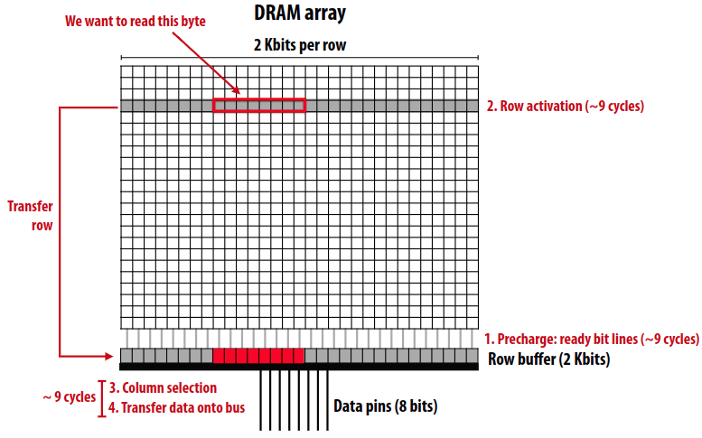 DRAM cell은 DRAM chip 내에 2차원 배열로 구성되며, row, column 번호를 이용해 각 cell의 주소가 정해진다. Row 방향을 word-line, column 방향을 bit-line이라고 한다. Column 방향으로 이웃하게 한 byte가 저장되는데, 따라서 Fig 2.의 빨간 박스는 하나의 Byte(=8 bits)를 나타낸다. 그림의 보면 cell 배열 뿐만 아니라 row buffer라는 것도 존재한다. Cell 데이터를 읽기 위해서는 cell에 직접 접근해서 읽는 것이 아닌 row buffer를 통해서 읽어야 한다. 즉 읽고자 하는 cell의 row를 row buffer로 복사해온 후, row buffer에서 데이터를 선택하고 data pins을 통해 CPU로 전송한다. 이 과정을 정리하면 다음과 같다.