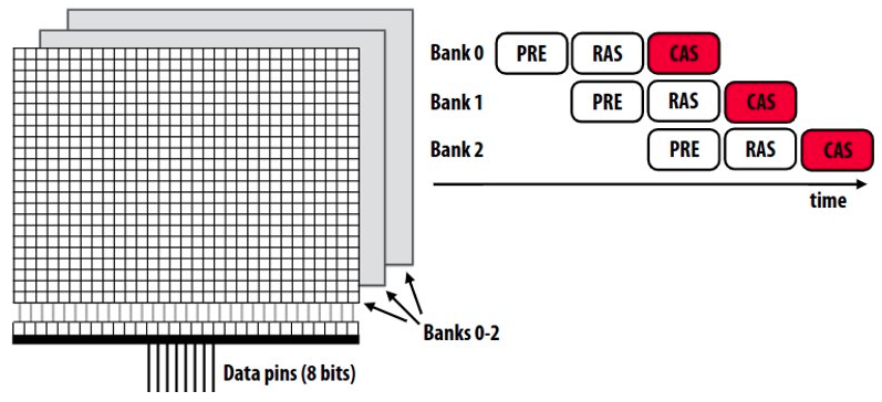 Burst 모드를 활용하더라도 PRE, RAS를 아예 제거할 수 없으며, RPE, RAS 동안에는 data pins(bus)가 idle하기에 매우 비효율적이다. 이를 극복하기 위해 DRAM chip은 여러 개의 bank들로 구성되어, data bus를 공유하도록 디자인되었다. 이를 통해 데이터 접근의 병렬성을 달성하였다. 그림 Fig 4.를 보면 bank들끼리 mux되어 data bus가 쉬지 않고 계속 일을 하는 것을 알 수 있다.