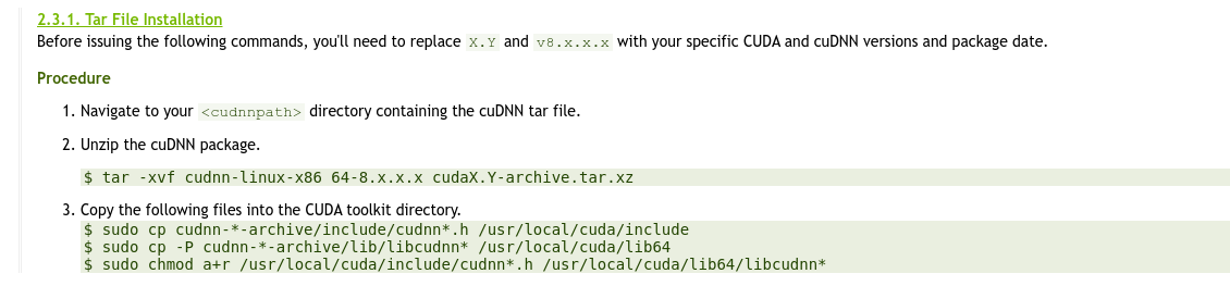 2. 다운 받은 shared library file들과 header files들을 정해진 위치(CUDA toolkit의 default library, include path)에 복사하기만 하면 된다. Fig 3.은 tar file을 어떻게 설치하는 지를 보여주는 것으로, 설치 위치 및 방법을 알려준다.