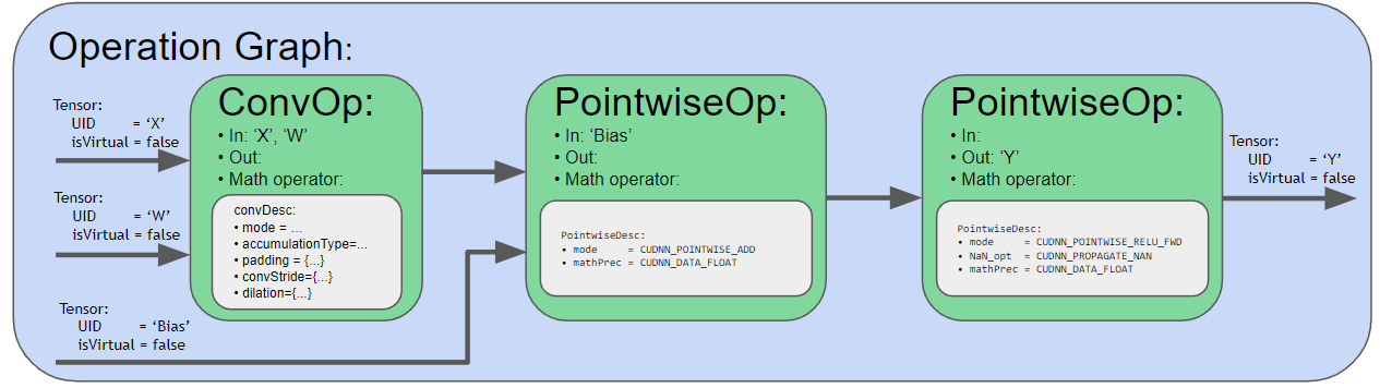 - Create the operation graph : 딥러닝 네트워크의 구조 및 각 operation의 tensor input/output(edge들)를 cuDNN Graph API를 통해서 명시함