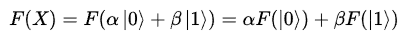 만약 X = α|0⟩ + β|1⟩ (where α + β = 1)일 경우 다음 Eq 1.과 같이 한번에 F(|0⟩)와 F(|1⟩)를 계산할 수 있을 것이다. F는 unitary operation이기에 각 ket에 대하여 분배법칙이 성립한다.