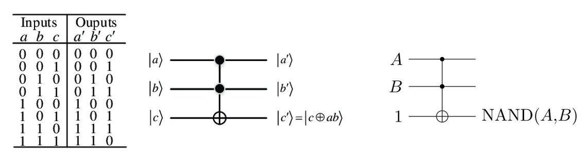 Toffoli gate는 양자 회로의 gate로 NAND 동작을 수행할 수 있다. 따라서 Toffoli gate만 있으면 모든 디지털 회로의 gates 및 회로를 만들 수 있다. Toffoli gate는 다음 Fig 3.과 같은 진리표를 가진다.