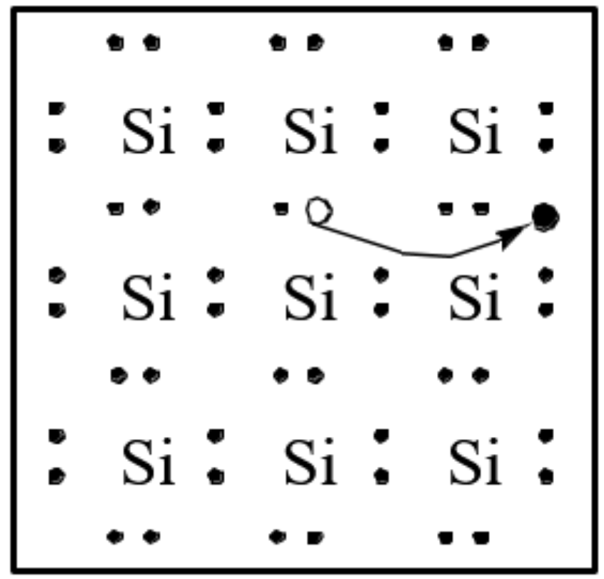 Fig 2.은 실리콘 원자들끼리의 결합을 표현한 그림이다. 실리콘 원자는 이웃한 4개의 실리콘 원자와 최외각 전자를 공유하며 공유 결합을 형성한다. 이때 전자는 약하게 결합되어 있기에 어느 정도 개수의 전자는 결합을 풀고 자유롭게 이동하는 경우가 발생한다. 이 전자를 자유 전자라고 하며, 이 전자가 사라지면서 생기는 결합 상의 빈 공간을 정공(hole)이라고 한다. 자유 전자는 (-) 전하를 가지고 있으며, 정공은 (+) 전하 ((-) 전하가 사라졌기에 (+) 전하를 가졌다고 함)를 가진다. 이들이 움직임으로서 실리콘 내부에 전류가 흐를 수 있다.