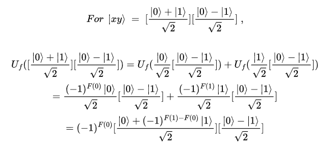 만약 F(0) = F(1) 이라면 Uf를 통과한 |x⟩ = (|0⟩+|1⟩)/sqrt(2)가 될 것이고, 이것을 마지막 hadamard gate를 통과시키면 |x⟩ = |0⟩이 될것이다. 반대로 F(0) != F(1) 이라면 Uf를 통과한 |x⟩ = (|0⟩-|1⟩)/sqrt(2)가 될 것이고, 이것을 마지막 hadamard gate를 통과시키면 |x⟩ = |1⟩이 될것이다. 따라서 우리는 마지막 |x⟩ 값이 |0⟩인지 |1⟩인지를 측정한다면 한번의 F(x) 연산만으로 F(0)과 F(1)이 같은 지 아닌 지를 판단할 수 있다.