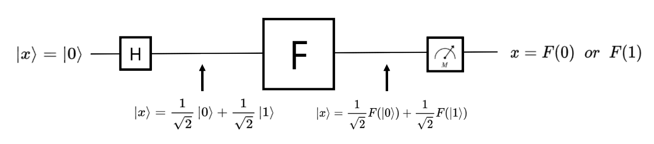 Fig 1. 처럼 |x⟩를 |0⟩으로 초기화한 후 hadamard gate를 통과하면 |x⟩는 |0⟩, |1⟩의 중첩 상태가 된다. 중첩된 |x⟩를 함수 F를 나타내는 양자회로를 통과시키면 |x⟩는 F(|0⟩), F(|1⟩)의 중첩 상태가 된다. 따라서 한번의 계산으로 F(|0⟩), F(|1⟩)의 값을 계산해 내었다. 문제는 양자의 결과를 관측하고자 할 때 발생한다. 중첩된 양자는 코펜하겐의 해석에 따라 관측 시 하나의 상태로 붕괴한다. 즉 관측 전의 |x⟩는 F(|0⟩), F(|1⟩)의 정보를 모두 가지고 있지만, 그 값을 알기 위해 관측하게 될 경우 x의 값은 F(|0⟩), F(|1⟩) 둘 중 하나로 결정된다. 따라서 양자 회로를 사용하더라도 디지털 회로와 마찬가지로 2번 이상 F(x)의 값을 계산해야 한다.