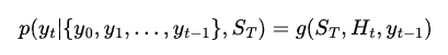 Encoder에 의해 encode된 독일어 문장은 (= encoded vector, 초록색 박스)는 decoder에 의해 해석되어 영어 문장을 출력하는데 사용된다. Fig 1.에서 보듯 decoder RNN은 encoder의 최종 출력값인 encoded vector와 함께 이전 영어 단어를 입력으로 받아서, 현재 영어 단어를 출력한다. 이를 식으로 나타내면 Eq 1. 과 같다. S는 encoder의 최종 출력 state를, H는 decoder의 hidden state, y는 영어 단어, Y는 영어 문장, g는 nonlinear funciton (여기서는 RNN)을 의미 한다.