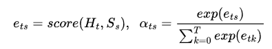 t시점의 decoder의 hidden state와 s번째 encoder의 hidden state와의 attention weight α는 Eq 3. 와 같다. H는 decoder의 hidden state, S는 encoder의 hidden state이다. score 함수는 일반적으로 dot product를 사용한다.