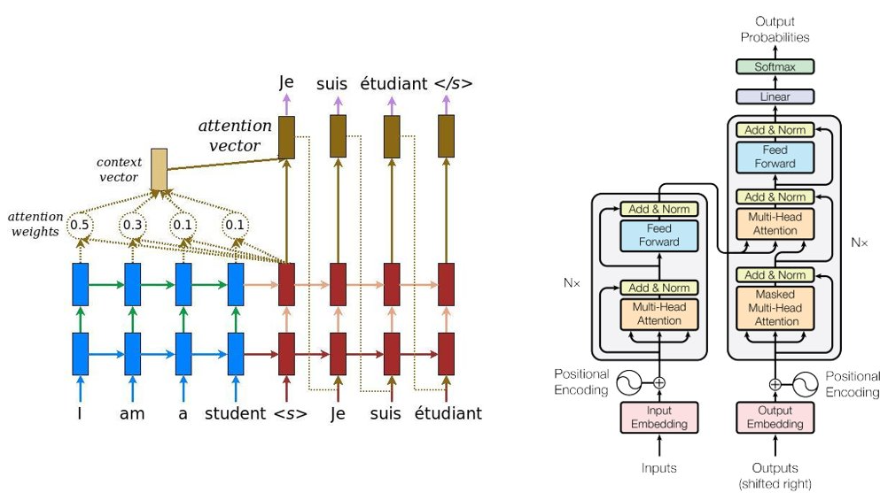 Fig 1.은 RNN을 이용한 encoder - decoder 구조(왼쪽)와 transformer를 이용한 encoder - decoder 구조(오른쪽)를 보여주는 그림이다.