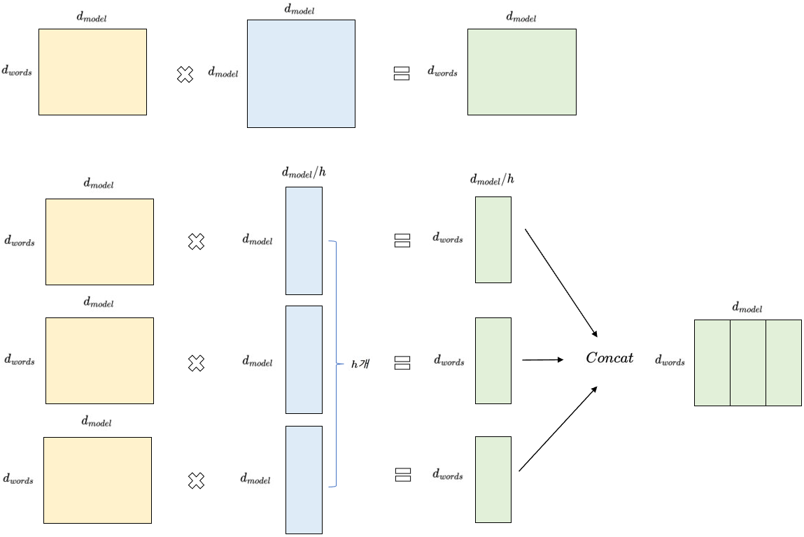 이때 논문[1]은 Multi-Head attention을 도입하는데, 이는 위와 같은 attention을 독립적으로 여러번 하겠다(=병렬로 구현하겠다)는 의미이다. Fig 2.의 오른쪽 그림이 multi-head attention을 잘 나타낸다. n개의 head가 있으며, 각각의 head는 Q, K, V를 구하기 위해 총 3번의 독립적인 linear(=FC=dense) 연산을 한다. 그리고 n개의 head의 output을 하나의 vector로 concatenate 하면 최종 output이 나온다. 미리 각 attention마다 결과값을 저장할 메모리 offset을 구해서 그 위치에 저장만 하면 concatenation도 병렬로 쉽게 구현할 수 있다. 즉 n개의 head는 병렬로 매우 쉽게 처리할 수 있다.