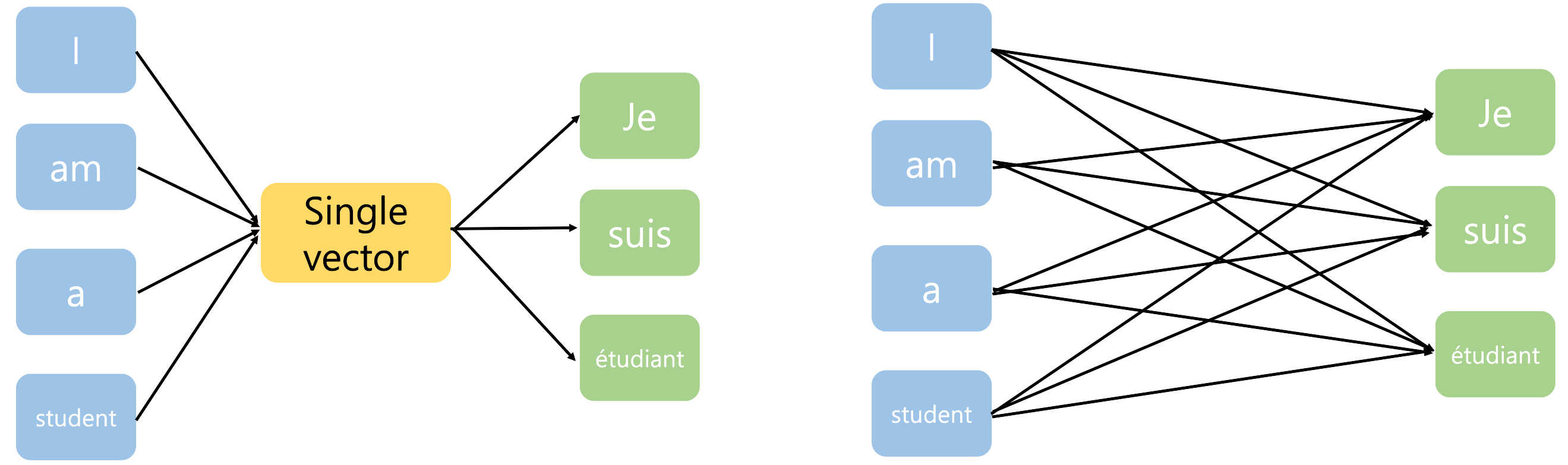 이를 해결하기 위해 attention mechanism이 제안되었는데, 왼쪽 그림과 같이 "Je"를 추론할 때, 영어의 모든 단어를 직접 고려할 수 있도록 connection을 만들어주는 것이다. 즉 Fig 2.와 같이 all(영어 단어들) -> one(vector) -> all(프랑스 단어들) 관계가 all(영어 단어들) -> all(프랑스 단어들), fully connected 관계가 된 것이다.
