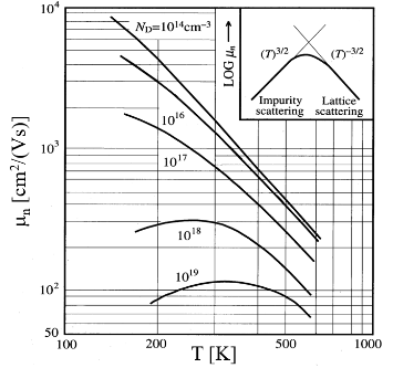 반도체 결정 내 자유전자는 scattering에 의해 운동을 방해 받는다. 따라서 scattering되는 정도에 따라 mobility가 결정된다. 앞서 얘기했듯 phonon scattering의 경우 온도가 증가하면 증가한다. 반대로 ionized impurity atoms scattering는 온도가 감소하면 증가한다. 대신에 불순물을 더 많이 첨가할수록(농도가 진해질수록) ionized impurity atoms scattering은 증가한다. 따라서 분술물 이를 식으로 나타내면 다음 Eq 4. 와 같다.