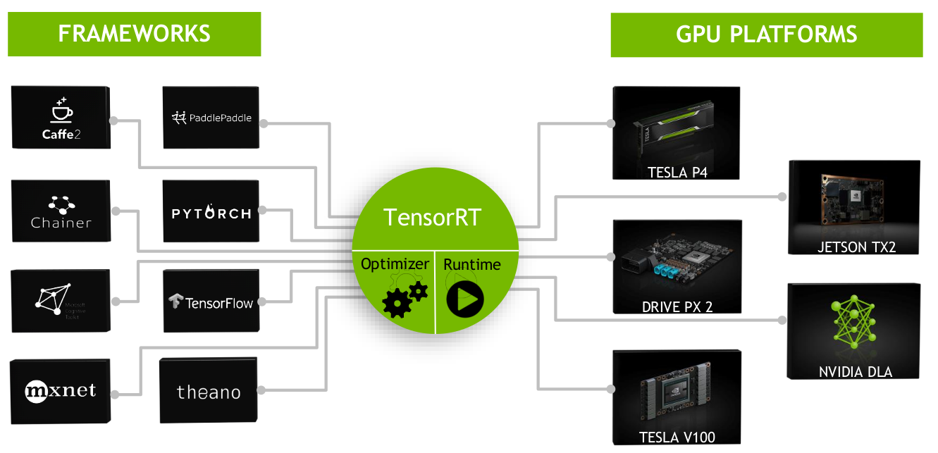 TensorRT는 실사용 환경에서 inference 과정을 자동 최적화하여 낮은 응답 시간과 효율적인 전력 및 메모리 사용 달성하고자 한다. 즉 TensorRT는 다양한 딥러닝 프레임워크 (Caffe, Pytorch, Tensorflow 등)에서 학습된 네트워크 및 실사용 환경(데이터센터, PC, embed system, 자동차 등)을 분석하여 자동으로 최적화된 딥러닝 네트워크를 생성한다. 이렇게 생성된 최적화된 딥러닝 네트워크는 해당 환경에서 일반 딥러닝 프레임워크에 비해 매우 향상된 성능을 보인다. Fig 1.은 TensorRT의 ecosystem을 보여주는 것으로, 다양한 프레임워크를 통해 학습이 완료된 네트워크를 다양한 실사용 환경에서 최적 배포할 수 있도록 도와준다.