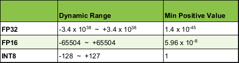 일반적으로 딥러닝 네트워크는 FP32 (32bit floating point) 데이터 타입으로 많이 구현을 한다. Fig 1.은 데이터 타입 별 표현 가능한 숫자의 범위 및 최소 숫자 크기를 나타낸다. FP32 데이터 타입은 ~10의 38승부터 10의 38승까지의 숫자를 표현할 수 있을 뿐만 아니라, 높은 정확도로 소수를 표현할 수 있다. 따라서 딥러닝 네트워크에서 사용되는 숫자(2.0123, -1.45, 0.0001 등)를 충분히 표현할 수 있을 정확도를 가진다.
