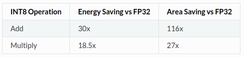 Fig 2.는 FP32 데이터 타입 대비 INT8 데이터 타입을 사용할 경우 얻게 되는 에너지 및 반도체 공간 상의 이점을 보여준다. FP32 데이터타입은 32bit를 사용하여 데이터를 저장한다. 만약 딥러닝 네트워크에 사용되는 데이터타입을 FP32에서 INT8 타입으로 바꿀 수 있다면 사용 전력(Fig 2.의 Energy saving 항목) 및 필요한 chip 공간 크기(Fig 2.의 Area saving 항목)도 줄어들 것이다. 또한 일반적으로 integer 연산은 floating 연산에 비해 (매우) 빠르기에[3] 추론 속도 향상을 기대할 수 있을 것이다. 이러한 맥락에서 딥러닝 네트워크의 데이터(parameters, tensors, feature maps) 표현에 사용되는 FP32 데이터 타입를 INT8로 바꾸려는 quantization 연구가 진행되고 있다.