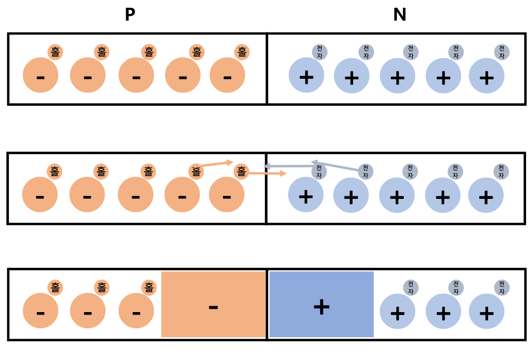 하지만 P형과 N형이 접합할 시, 자유 전자와 정공의 농도 차이에 의한 확산이 발생한다. P형 반도체 내의 정공은 N형으로, N형 반도체의 자유 전자는 P형으로 확산한다. 접합면에 인접한 P형 반도체 영역의 정공들은 N형 반도체로 넘어가고, 이 영역에는 (-)전하를 가지는 acceptor 이온들만이 남게 된다. 마찬가지로 접합면에 인접한 N형 반도체 영역의 자유전자는 P형 반도체로 넘어가고, 이 영역에는 (+)전하를 가지는 donor 이온들만이 남게 된다.