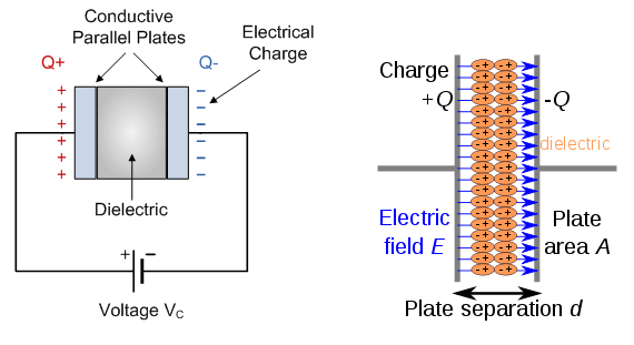 커패시터, 축전기는 전기전자회로에서 전기 용량을 전기적 퍼텐셜 에너지로 저장하는 장치[1]로, 쉽게 생각하여 전기를 저장하는 소자이다. Fig 1. 왼쪽 그림은 커패시터를 나타낸 모형도로 두 개의 판(plates) 사이에 유전체(dielectric)을 넣어서 만들어진다. 두 개의 판에 Vc의 전압을 인가할 경우, 유전체에는 Q만큼의 전하량이 저장된다.