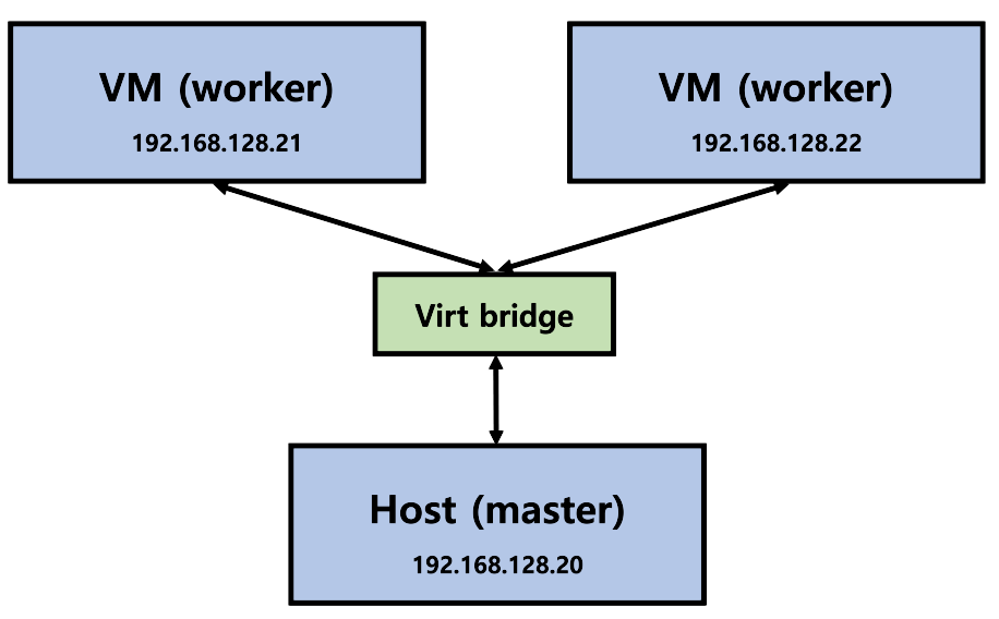 설치 테스트를 위해 가상화를 이용하여 Virtual machine(VM)를 생성하고, host system과 VM들을 이용하여 MPI 통신을 테스트하였다. 가상화 솔루션으로 qemu-kvm을 이용하였으며, qemu-kvm을 통해 2개의 VM을 생성하였다. Host system과 2개의 VMs 모두 ubuntu 18.04가 설치되었다. 테스트 환경을 도표로 나타내면 다음 Fig 2.와 같다.