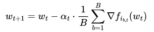 Weight update 과정에서 대부분의 딥러닝 네트워크는 SGD를 활용한다. t시간의 weights를 w_t, (t+1)시간의 weights를 w_(t+1), delta_f를 gradient, B를 mini-batch 사이즈, 알파를 learning rate 라고 할때, SGD 업데이트는 Eq 1.과 같이 표현할 수 있다. Eq 1.에 따르면 B개의 input(데이터)에 대하여 각각의 gradient를 구한 후, 그 값의 평균을 이용해 weight update를 진행한다.