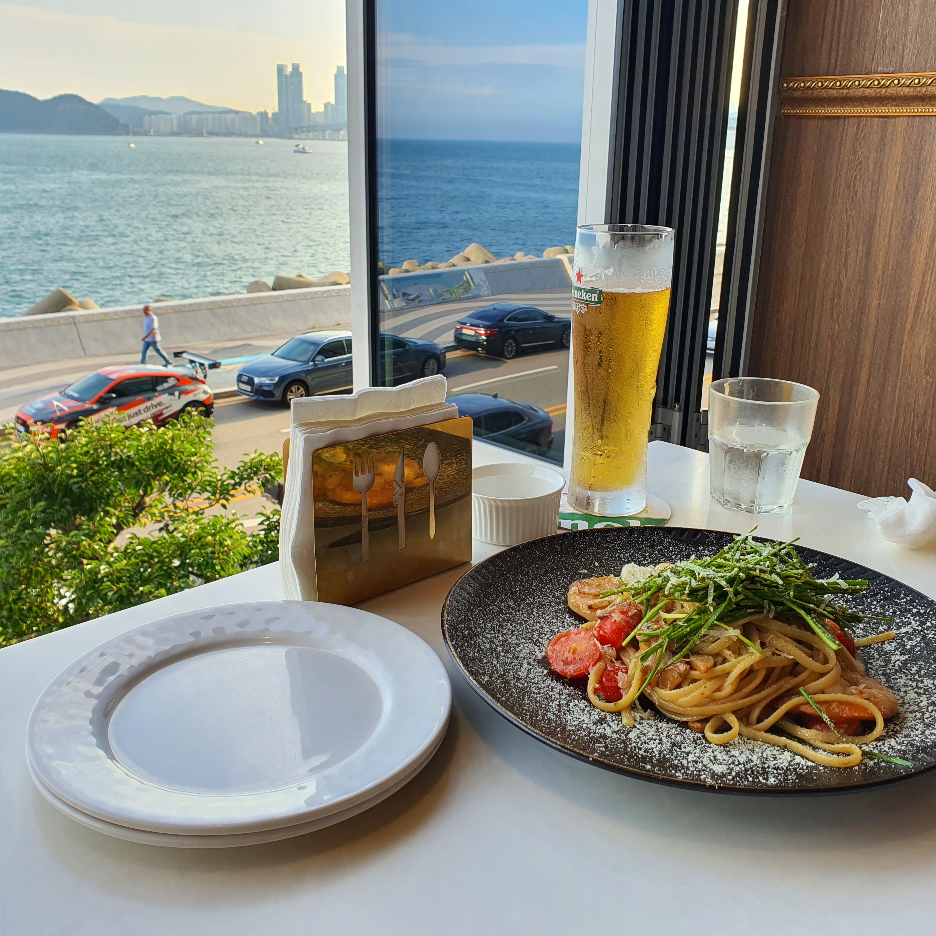 해운대 마린시티에 위치한 이탈리아 레스토랑 씨엘로이다. 식당 창 밖으로 광안리 바다와 광안대교가 보이는 매우 멋진 곳이다. 다만 단체 예약은 가능한데, 2인 예약은 안되어서 창가 자리를 선정하기 위해서는 조금 빨리 가야할 것이다 (2022년 7월 기준. 바뀌었을 수도 있으니 문의는 한번 해보자). 가격도 비싸지도 않고 뷰도 좋은 괜찮은 레스토랑이었다.