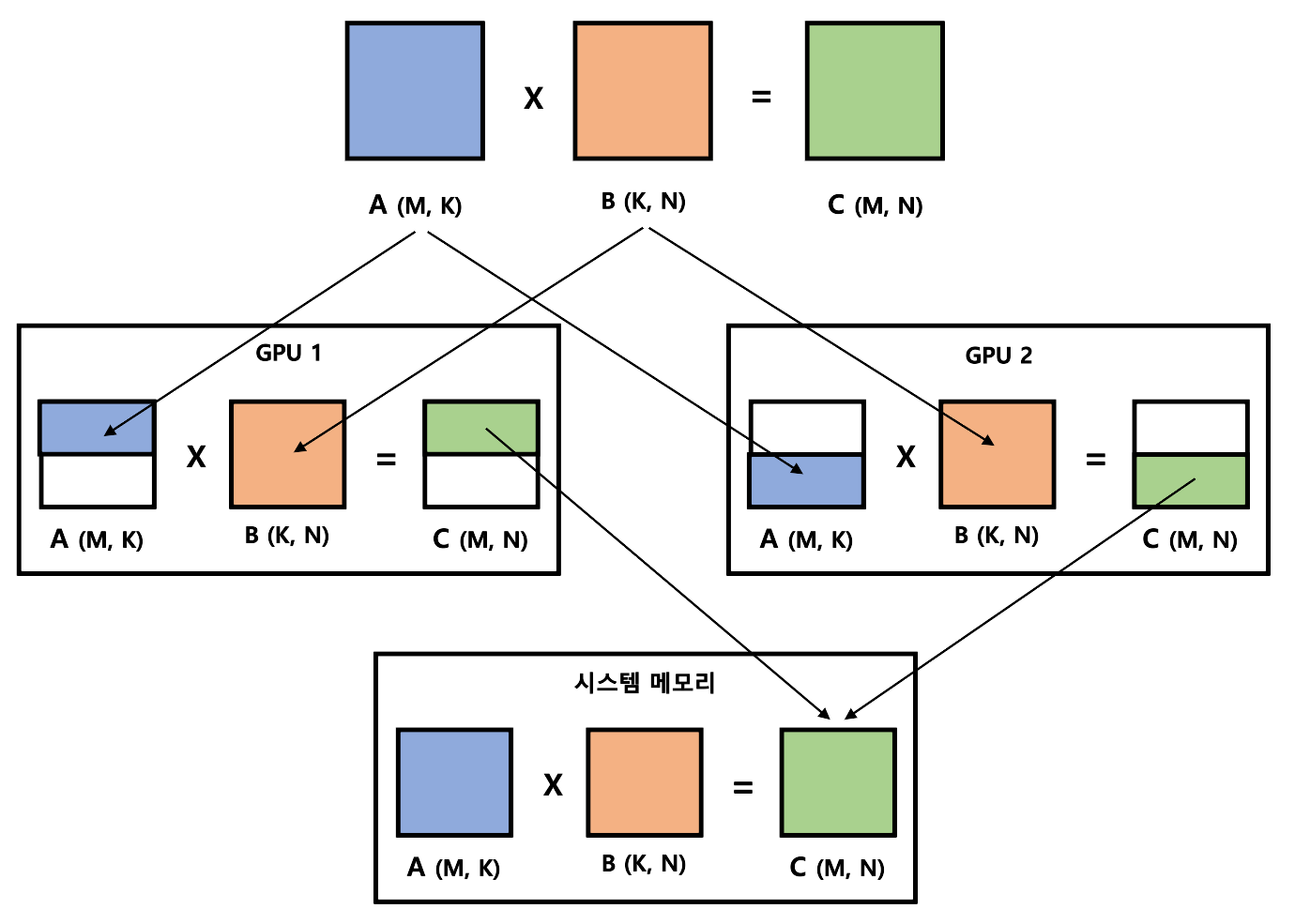 행렬 A, B에 대하여 행렬 C = AB를 구하고자 한다. 다음 Fig 1.과 같이 2개의 GPU를 이용한 행렬곱을 구현할 수 있다.
