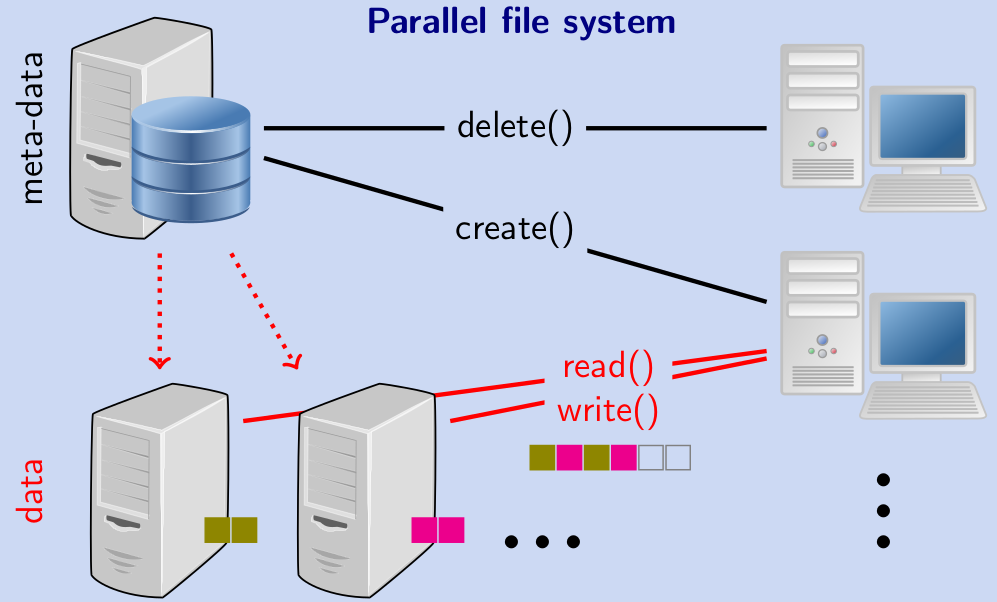 이렇게 data를 저장하는 서버와 metadata를 저장하는 서버를 분리하여 구축함으로서, Lustre는 파일 입출력 성능 향상을 달성한다. 수 많은 사용자가 동시에 여러 파일에 접근할 때, 사용자는 MDT에서 파일(실제로는 objects)가 어디 OSS에 저장되어 있는 지 정보만 획득한다. 그 이후부터는 사용자는 원하는 파일(objects)가 저장된 OSS와 직접 통신하며 데이터를 입출력한다.