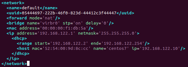 $ virsh dumpxml [vm name] | grep "mac" // ex) virsh dumpxml vm | grep "mac"